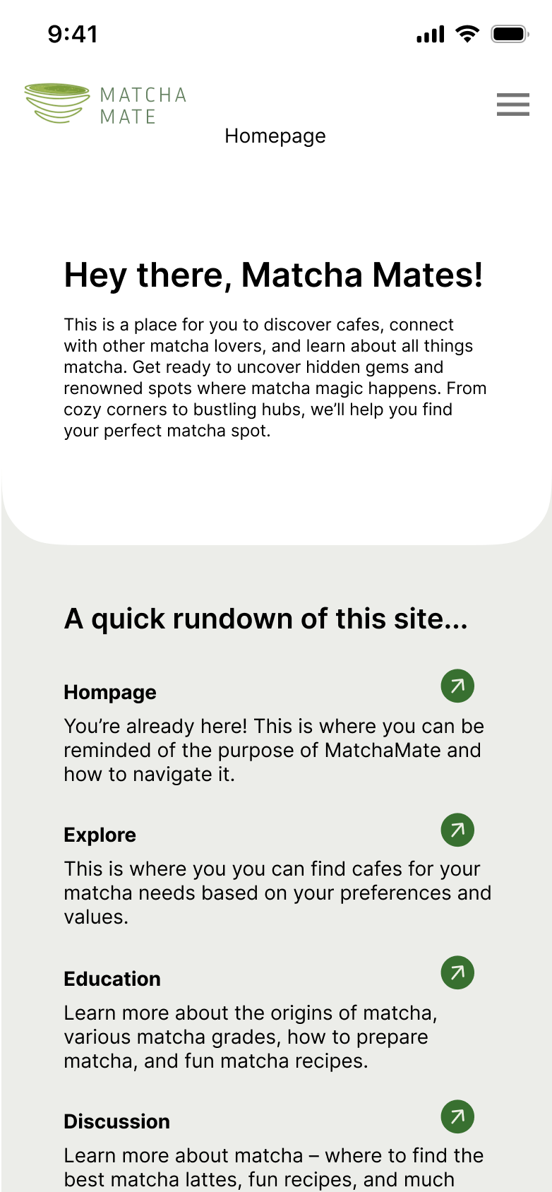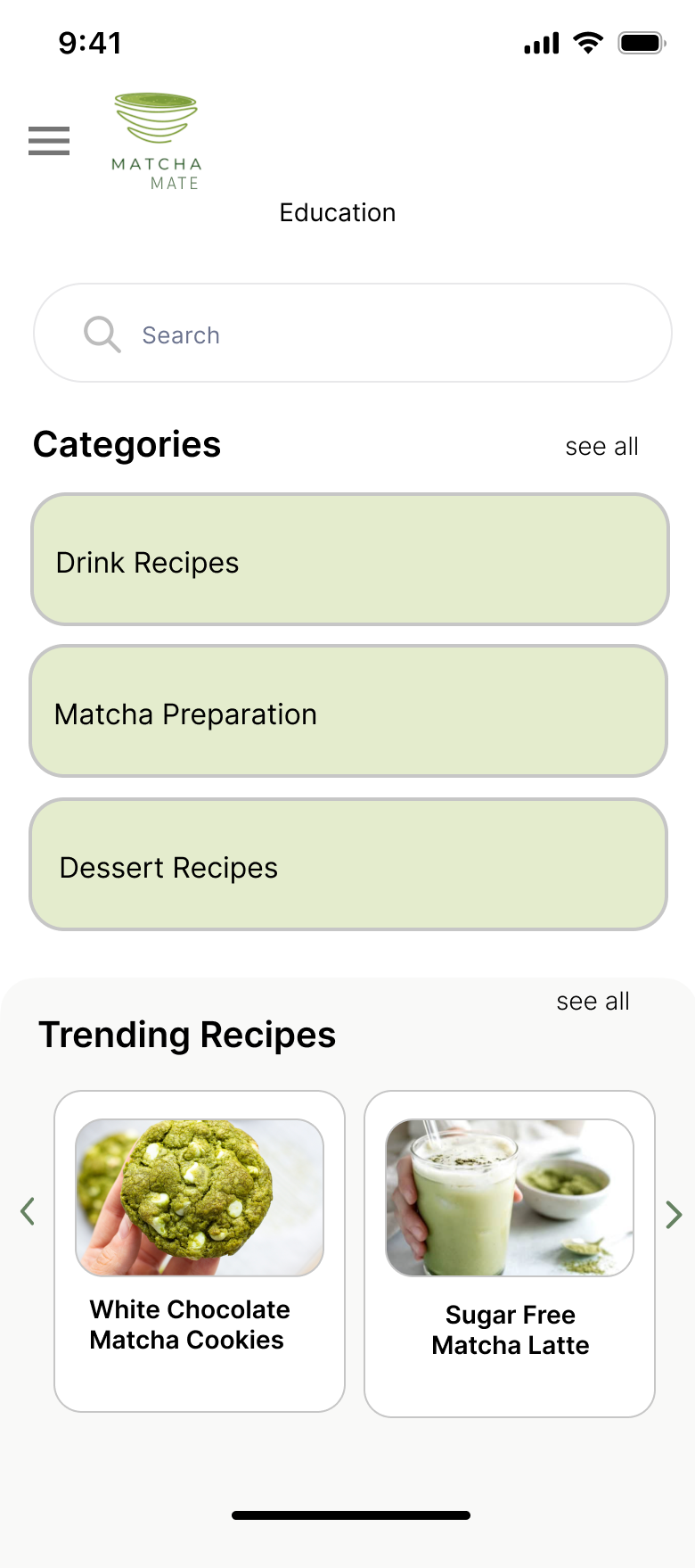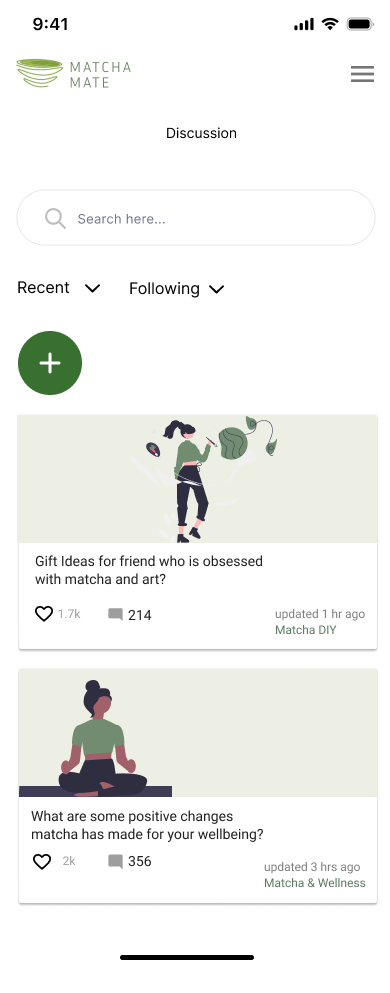 To address these challenges, we designed "MatchaMate," an app that creates connections among matcha lovers. Our platform offers a variety of features tailored to the needs of matcha enthusiasts. Users can participate in forums to discuss all things matcha, share and discover new recipes, and use the cafe search feature to find local spots serving high-quality matcha. Additionally, the app includes an educational feature where users can find and learn about a wide range of matcha-related products and tips. By providing these resources, "Matcha Mate" aims to simplify the matcha experience, making it more accessible and enjoyable for everyone.