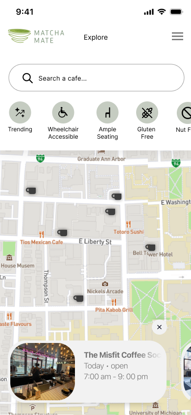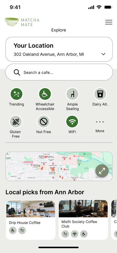 MatchaMate’s interactive map allows users to input their location and discover nearby cafes that offer matcha drinks. Each tagged location on the map includes icons indicating allergen and accessibility features, ensuring that users can find suitable venues that meet their dietary and mobility needs. The map also features community reviews with a five-star rating system, providing insights from fellow matcha enthusiasts.