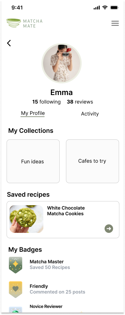 To incentivize engagement, MatchaMate features milestone badges awarded to users for achieving specific levels of activity (Figure 1). For example: