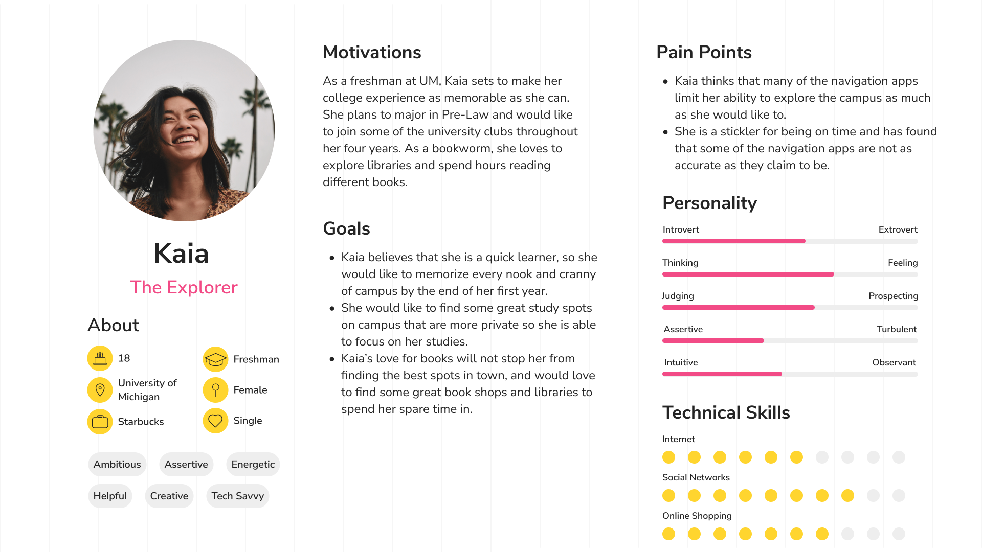 By teaming up with students and digging into their daily experiences on campus, we brainstormed a better way to get around and make everyday commutes easier. By listening to their feedback and understanding their struggles, we developed an intuitive wayfinding app designed specifically for UMICH students. Our design includes features like real-time building and class location, optimized bus routes, and personalized navigation help.